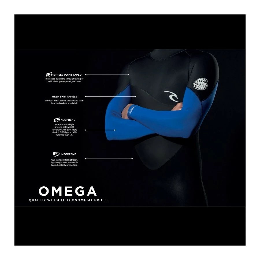 La Omega est en nĂ©oprène E5 sur les bras et en nĂ©oprène E3 sur le corps. La combinaison est intĂ©gralement cousue collĂ©e et un tape intĂ©rieur renforce les zones les plus sollicitĂ©es. C’est la combi idĂ©ale pour ne pas nĂ©gliger le confort avec un petit budget.